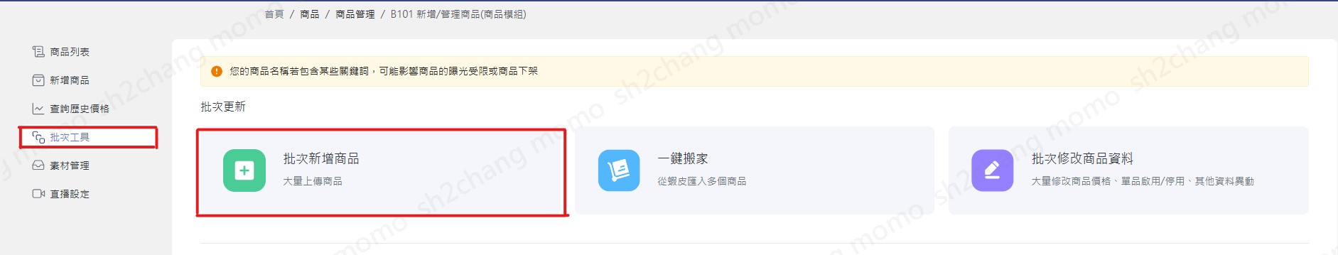 請由下列功能路徑:商品/商品管理/ [ B101 ] 新增/管理商品,勾選欲調整的商品匯出檔案,修改商品資料後,再匯入檔案上傳。 目前僅上線:價格、庫存、單品上下架異動。