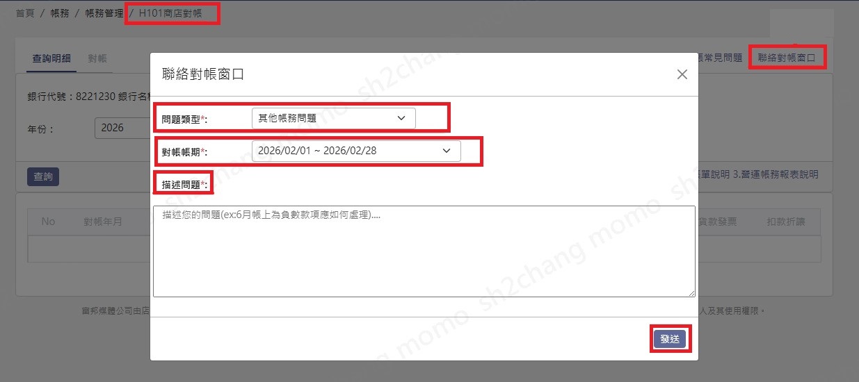 請至後台帳務>帳務管理>H101商店對帳右上方"聯絡對帳窗口",填寫相關問題並送出。