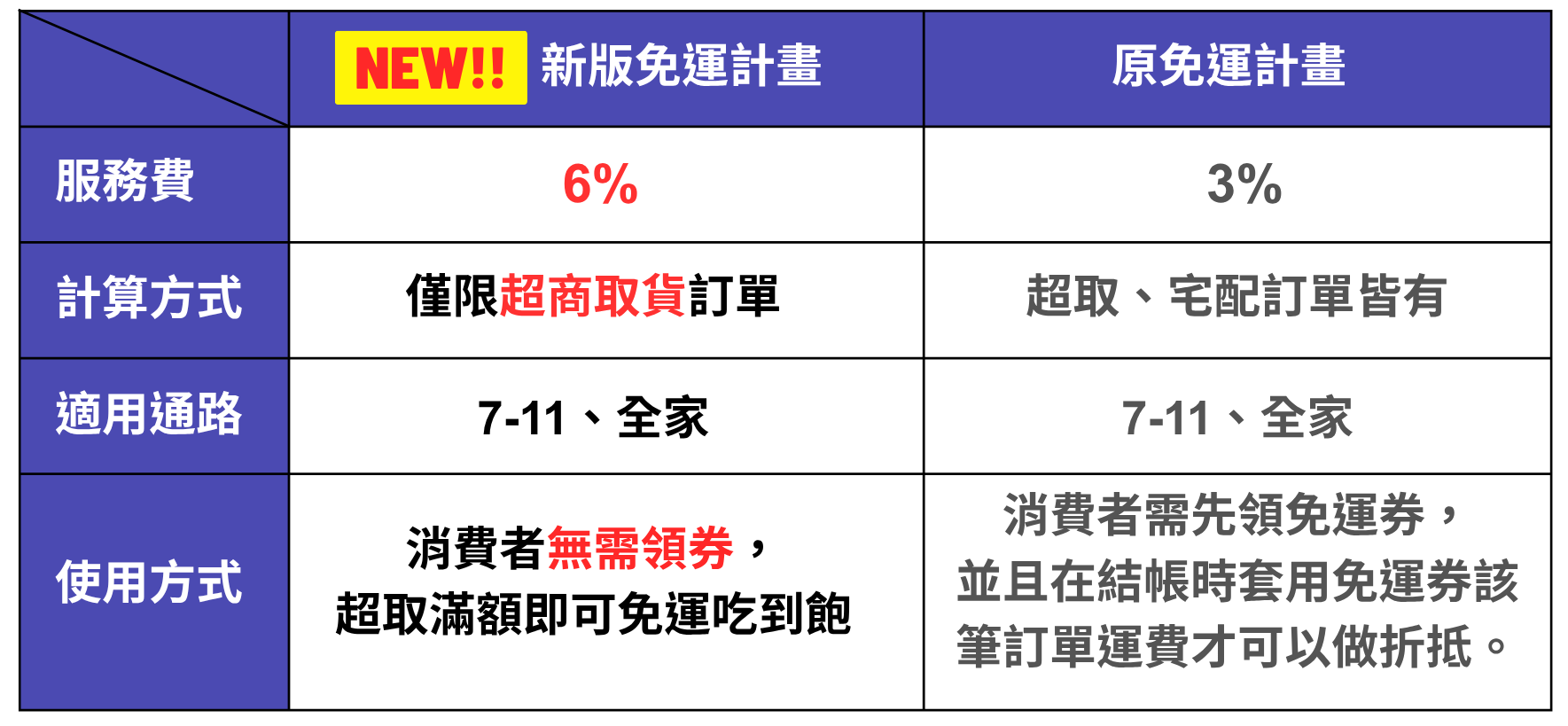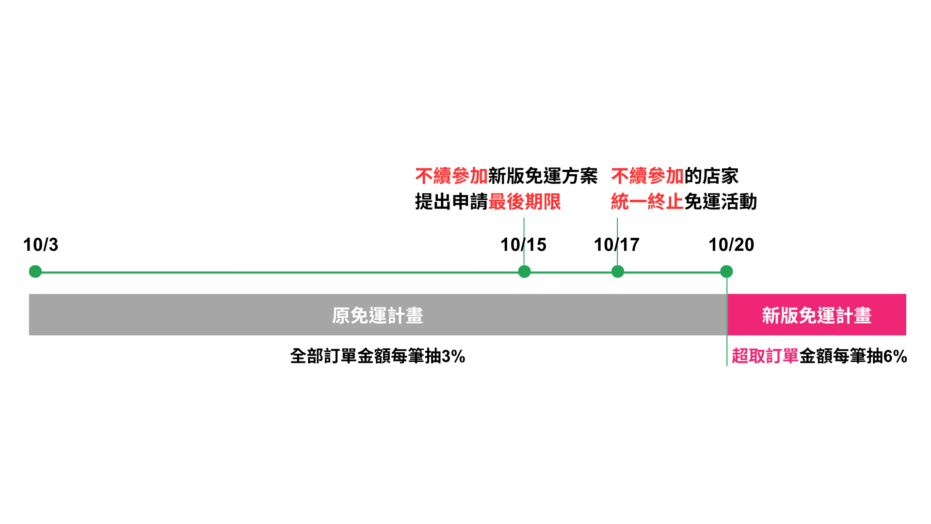 - ※如有續參加新版免運計畫,10/20(一)以前依舊維持全部訂單金額每筆抽3%(不包含平台活動折扣),10/20(一)起計算方式將調整為超取訂單金額每筆抽6%(不包含平台活動折扣)。